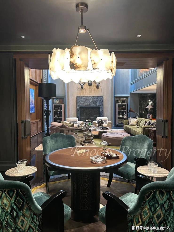客厅整体面宽达9米,亮色装饰线条的深绿色墙面还原海派建筑风华,也彰显传承之意;La Greca模块化主沙发由意大利顶级奢侈家居品牌VERSACE出品,自由子和的茶几组合一款由艺术家雕刻出花叶后固化封脂而成,另一款则采用意大利翡翠玉打造,散发着低调奢华的艺术格调。