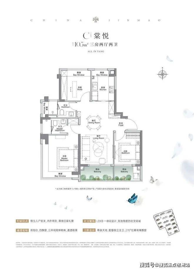 105㎡的样板房,做到了 三开间朝南4个飘窗+双阳台系统 +主卧套房设计+270°转角飘窗,这个户型的居住体验、舒适度、尺度感,是97㎡户型产品所无法比拟的。