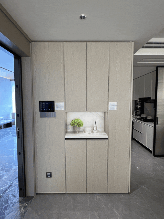 入户左手边有 通顶玄关柜(不交付),内置鞋柜精灵 ,可以看到玄关内部的隔板也是高度不一,普通鞋子、高跟鞋、杂物等等,都有分区。