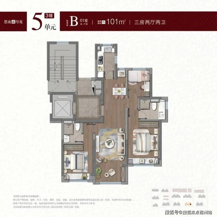 建面约100-101㎡户型, 拥类独立电梯厅,无连廊+飞机户型南北通透