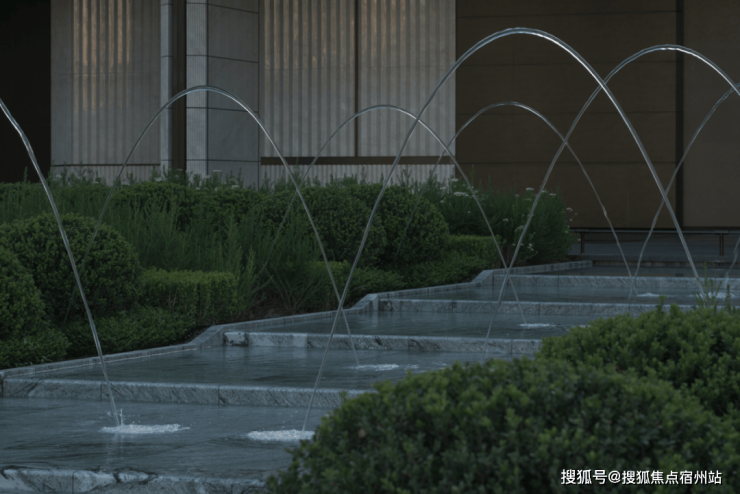 花池与水台的交界近景,借由地形高差,让水景与绿植形成丰富层次,以现代手法将自然意趣浓缩于一方天地,两种质感、深浅的体块嵌合之美,涌泉隐没在体块间,在日常风景里增加一点诗意的氛围。