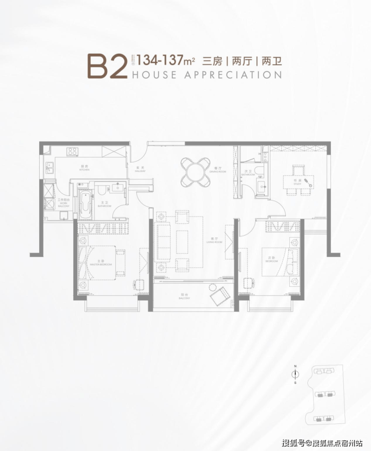 B2户型 建面约134-137㎡ 3房2厅2卫