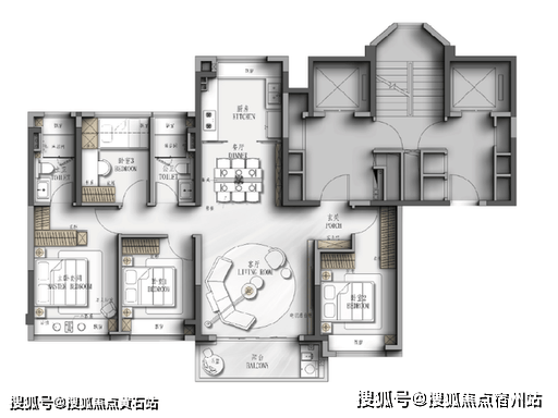 格局:四叶草布局、7 个飘窗、横厅、双套房、中西厨