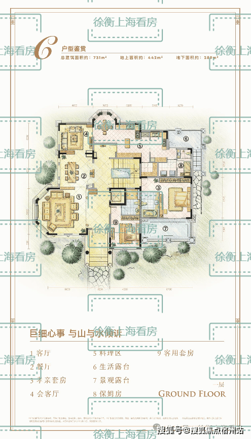 项目依据地势优势,依托佘山地块原有的植物生态体系,保持了佘山丘陵地貌的林间野趣,更增添了浓郁的优雅氛围。庭院摒弃了传统建筑围合法,利用层次丰富的绿篱植被分隔,与意式浮雕外立面形成视觉上的互动。端庄大气的建筑形象,在柔和的绿意中点缀出圈层家族的生活质感。采用合生首创的双首层设计,双入户模式,双客厅配置,户型非常大气磅礴。