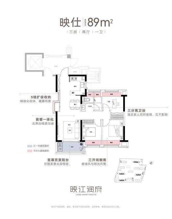 华润映江润府售楼处电话:400-856-9058亮点一 :不足90m²做三房,完美平衡舒适度,该户型很好的兼顾了功能性与总价段,让更多希望改善居住品质的人,可以实现在城区买到华润置地的品质好房,而且户型设计整体方正通透,三开间朝南,良好的采光效果,很好的关照了居住舒适度。华润映江润府售楼处电话:400-856-9058