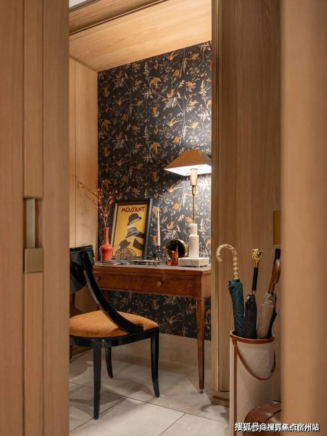 玄关具有变化性与功能多重性,壁纸融合中西方色彩和纹样,天潼198售楼处电话:400-8266-670☎️☎️✅✅除了更衣功能,更摆放了古董书写桌,以手写文字传递信息,传递慢节奏生活方式,丰富空间的装饰和功能,目光所及视角变得丰富。天潼198售楼处电话:400-8266-670☎️☎️✅✅