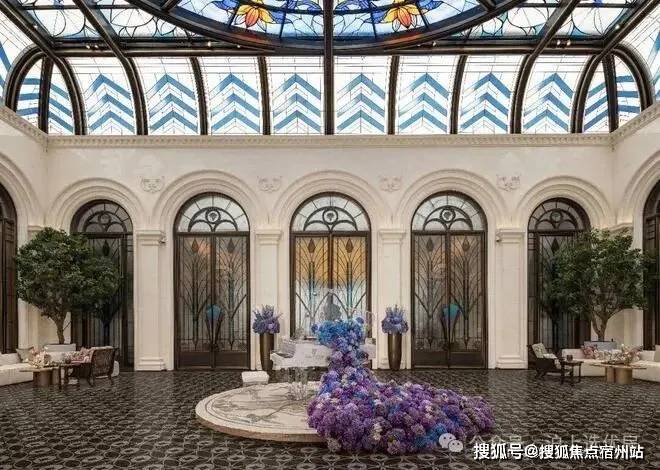 彩绘玻璃穹顶漫射柔和天光,艺术拱门与浮雕墙面交替排列,中央紫蓝渐变花艺装置描摹四季流转之美,可上演私享音乐会、业主演说会、亲子读书会、浪漫下午茶等,复现百年和平饭店的顶层社交场景。
