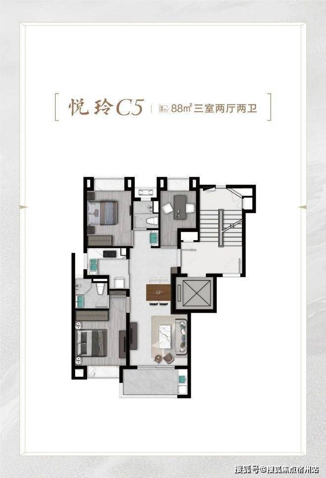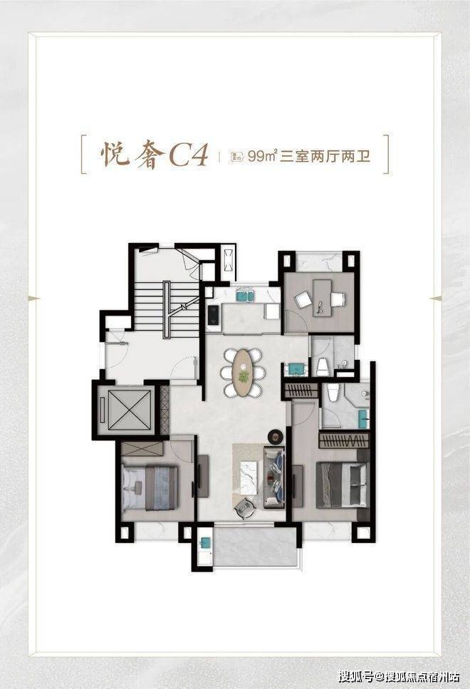 再比如C6悦尊户型建面约96㎡3房2厅2卫,比C4悦奢户型少3㎡,总价也适当降低。C4户型该有的优点,也全都有,比如: