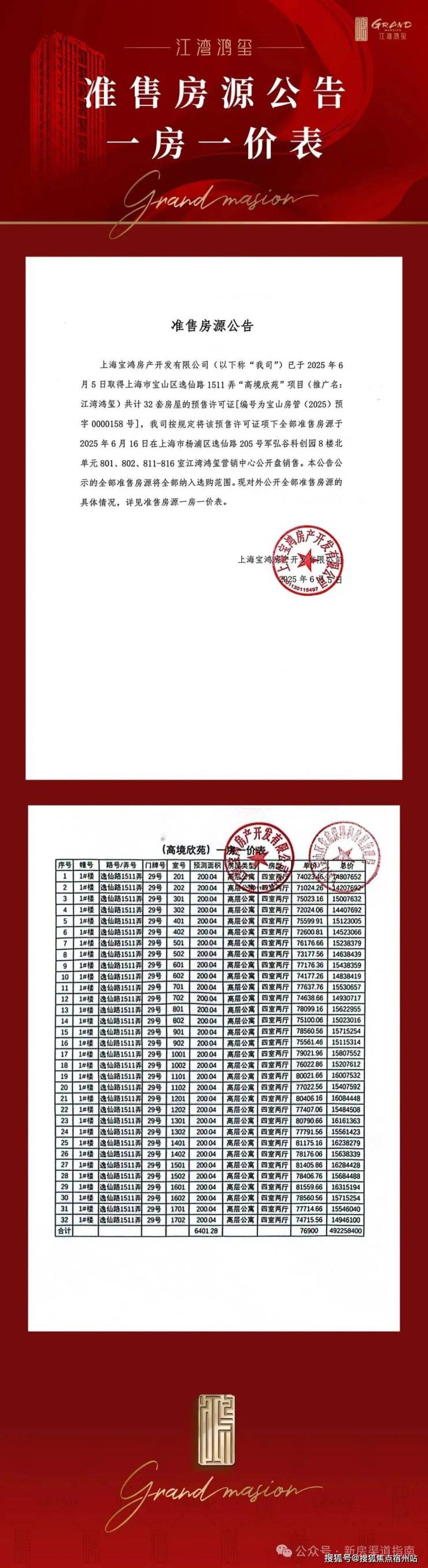最新消息,宝山高境「江湾鸿玺」在售中!推出建面200㎡大平层,总价约1420万起!