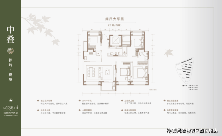 建面约137㎡下叠, 四房两厅三卫 全能格局,非常适合二娃家庭以及三代同堂。