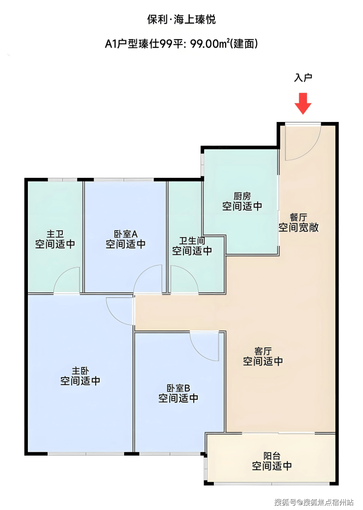 建面约99㎡三房两厅两卫 (刚需改善首选):采用LDKB一体化设计,客厅、餐厅、厨房与阳台无界联通,形成通透的“家庭核心区”。入户玄关配备约2.8米超长收纳柜,厨房升级为双面岛台设计,收纳空间扩容30%。三开间朝南布局搭配全明飘窗,主卧套房配置独立卫浴与观景飘窗,兼顾实用性与舒适度。