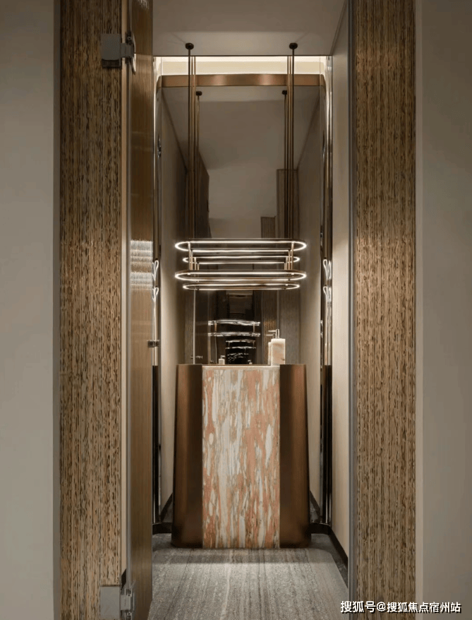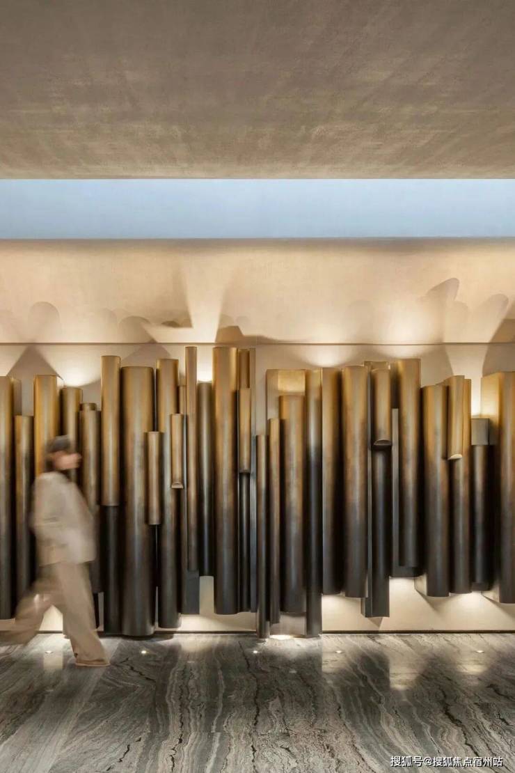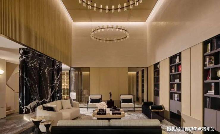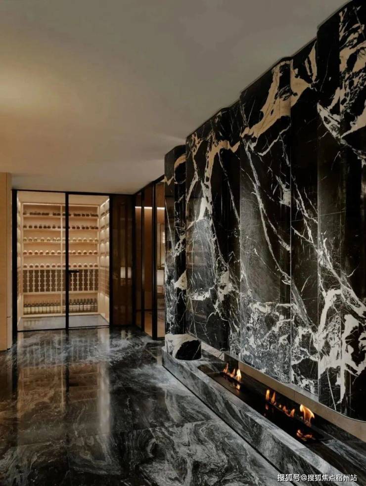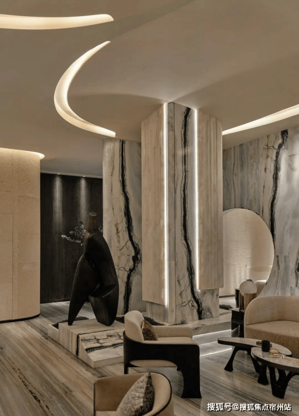 地下一层的沙龙区更是李玮珉 “材料叙事” 的典范:黑底米白纹样的大理石背板如同一幅水墨画卷,圆圈吊灯柔和了挑高空间的空旷感,内置书架与艺术雕塑的点缀,让 “私人外交” 的氛围悄然生长。