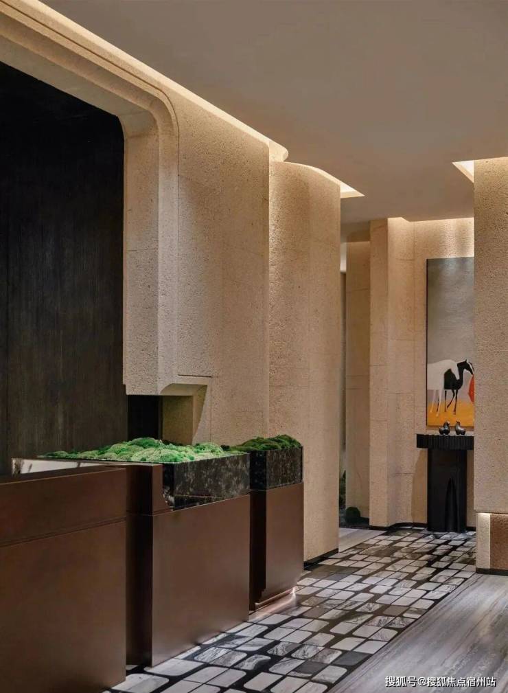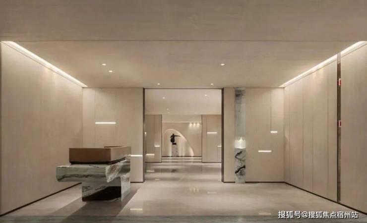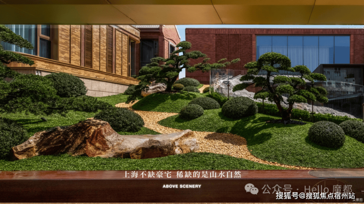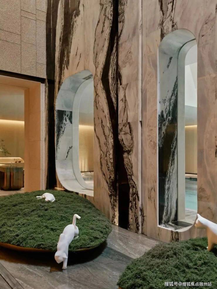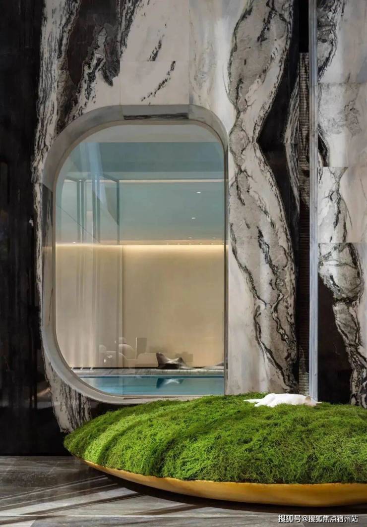 会所 “谿山” 是其东方美学的集中体现:入口处一方熊猫白石材体块,纹路如江水般流淌,中空的圆拱造型像游园时偶遇的山洞,引导着访客进入 “隐世之境”。