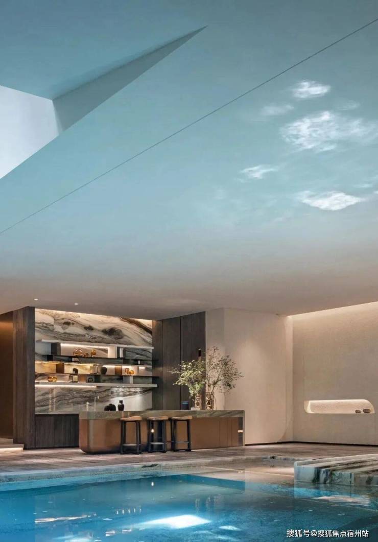 游泳池以罗马会场泳池为灵感,汲取《观瀑图》的山水意境,将古典与现代完美融合。池畔以大理石铺就,线条优雅如古罗马建筑的恢弘气势,而池中水波粼粼,光影交错间,水幕如瀑,营造出“人在画中游”的诗意境界。