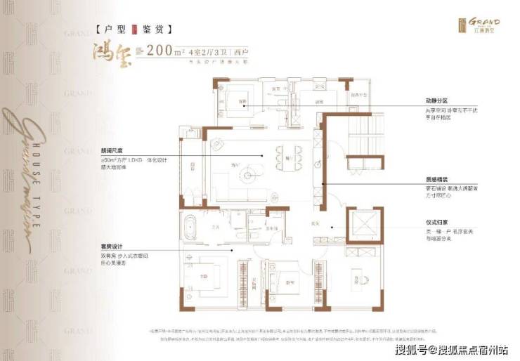 建面约200㎡4房2厅3卫户型,做到了 三开间朝南+主卧豪华套房设计+南北通透,保证每个家庭成员都能有自己独立的居住空间,私密性拉满。