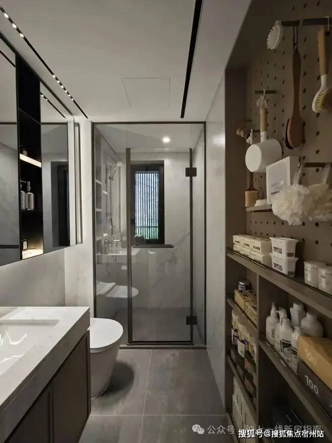 另外,在卫生间部分,项目在台盆对面做了一个墙体的向后延伸,再次做出一个超大尺寸的洞洞墙板和储物柜,原本只有镜柜的收纳空间瞬间就扩大了不止一倍。