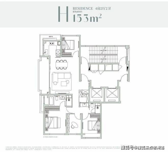 经典的四叶草布局,四开间分布在四角,兼顾私密与互动,是二胎家庭的优选。