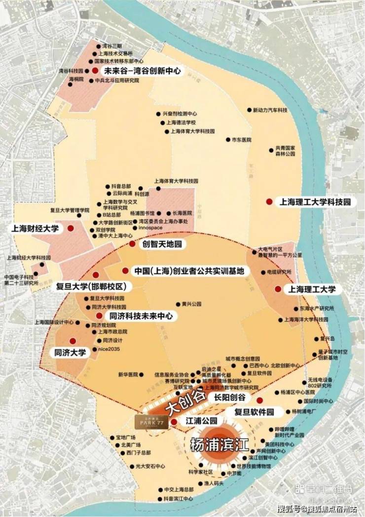 最新发布的科创扇面,以5公里的创新半径,在杨浦滨江南段徐徐展开以江浦公园为支点,将“扇面”展开,上海最密集的高校智力资源汇聚于此北望4公里,百年复旦;向西3公里,同济巍然;东南5公里,上海理工;聚合高端人才、链动产城资源,创新杨浦