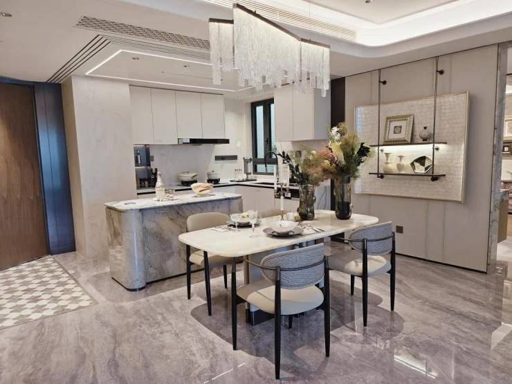 柜门白色烤漆面板,抽屉分区也都是帮大家细致划分,如多功能调味拉篮+谷物抽+碗碟拉篮等。岛台上配置可升降插座,铝合金抽屉,石材背景板的金属开放格实用性很强。 海上清和玺售楼处电话:400-8894-638