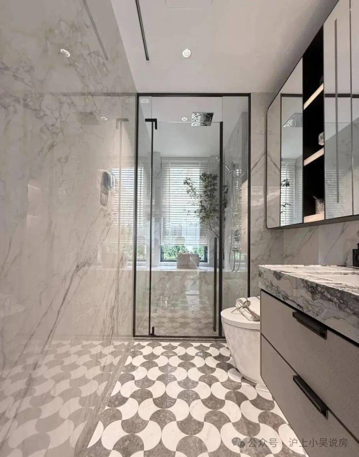 奢石台面,皮革饰面柜抽屉,侧端设置金属收纳开放格;定制镜柜,中间的透光玉石直接提升了高级感,镜柜内部配备了美妆冰箱+美妆灯条+轨道收纳!