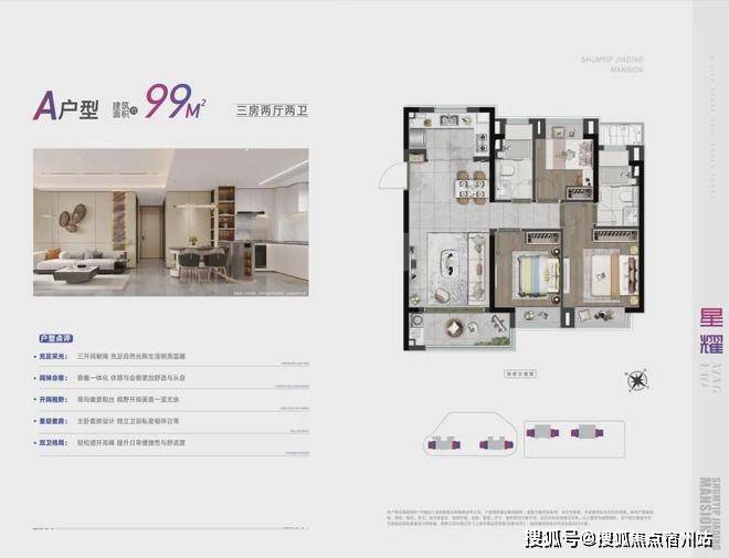 建面约99㎡的三房两厅两卫,很适合一家三口的上车的作品。三开间朝南,南北通透,动静分区,户型非常方正!