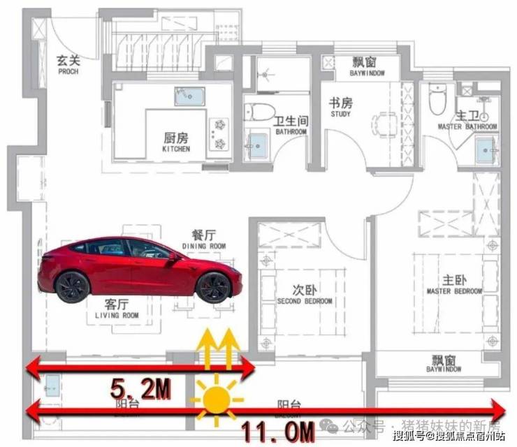 创新性设计了约 1.5个面宽的横厅,整体面宽达到了约11米 (轴线尺寸 ) ,其中横厅面宽就有约 5.2米 (轴线尺寸) ,相当于把 Model 3横着放进来。