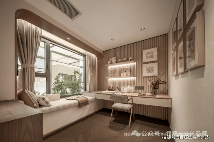 整个主卧尺度感是非常宽绰的,加上飘窗带来的视野延展以及收纳空间,居住舒适度拉满。