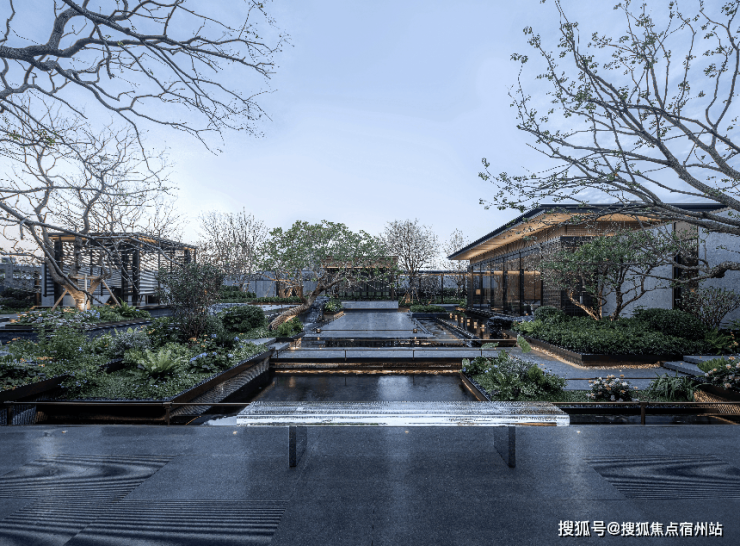 打造 长约200米、近1000㎡ 水系景观,贯穿入口、庭院、归家轴线和景观主轴,采用 五重造水形态 ,可行、可望、可游、可居,正是中式园林所追求的空间意境。
