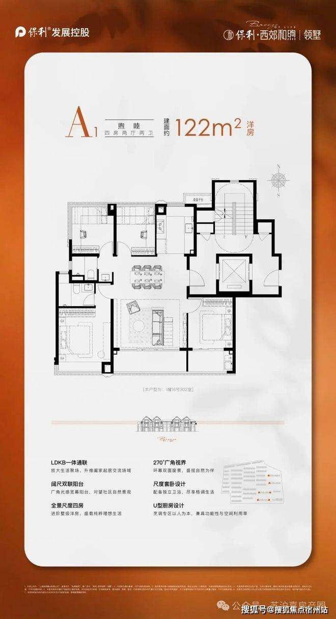 建面约122㎡4房2厅2卫墅境洋房,总价约500W级享3+1飞机户型!