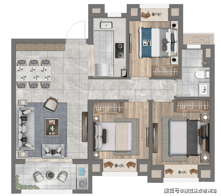 注意看,餐厅摆了一张六人桌。您可能觉得是不是画错了,现在部分90多㎡户型连摆一张四人桌都够呛。
