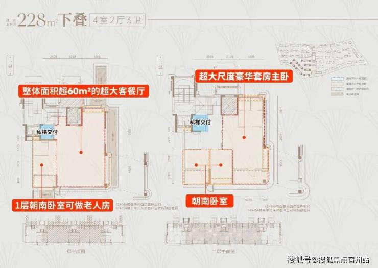 上叠功能性与下叠看齐,也是 四个朝南的全明卧室,主卧豪华套房配置 ,外接 南向超大露台 ,观星品茗无比惬意;