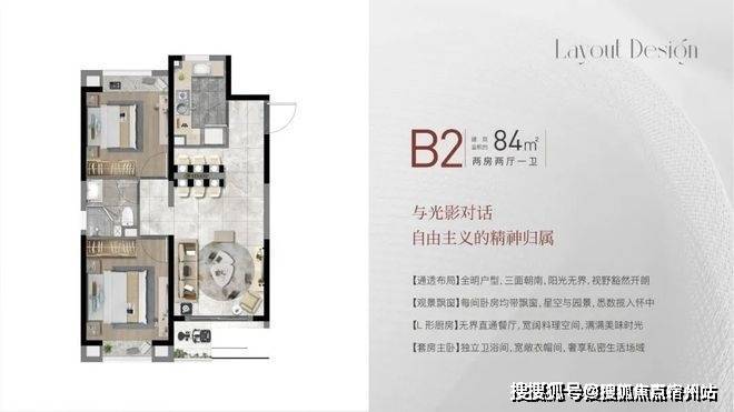 大名城 映雨江南售楼处预约电话:400-8824-198建面约84㎡2房2厅1卫,做到了双开间朝南+双卧室带飘窗+动静分离,非常宽敞的2房户型。