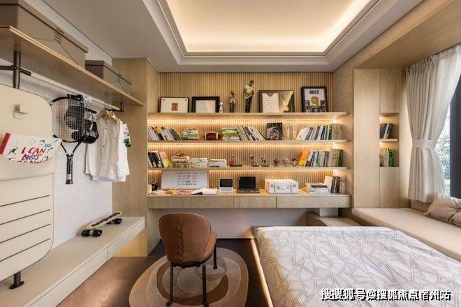 其中主卧的270°转角飘窗就有约5.7m²,通过与外立面的结合,直接做了梳妆台和储物柜,拓展了飘窗的实用性。
