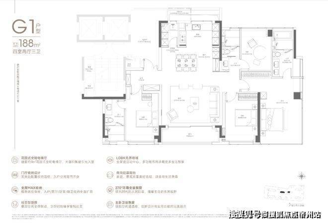 188户型2梯2户,有独立的电梯厅。4房3卫设计,✅✅中環置地中心·望雲售楼处电话:400 - 8824 - 258✅✅还是3明卫,这两点还是不错的。