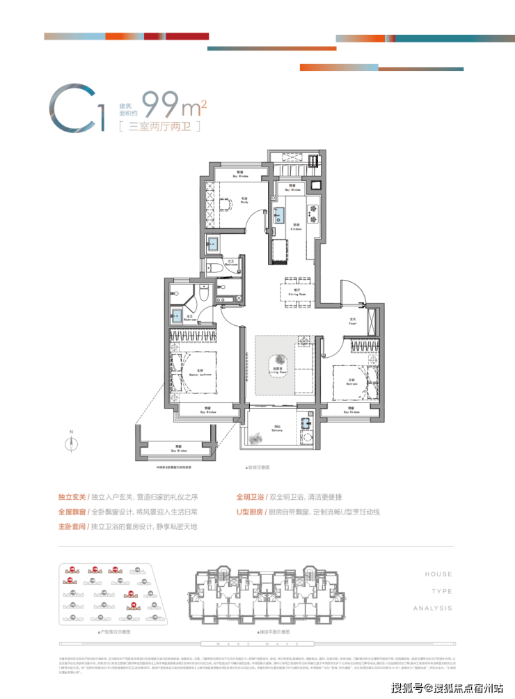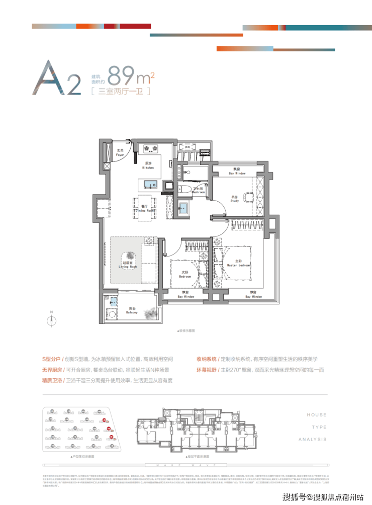 建面约89㎡3房东边套主卧配置约270°双向采光飘窗、S墙设计;