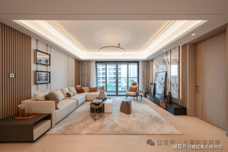 从项目南入口,穿越前厅的潺潺水景,便是与社区建筑完美融合的门厅大堂,其设计简约而不失精致,摒弃繁复细节,彰显出新海派独有的高雅格调。