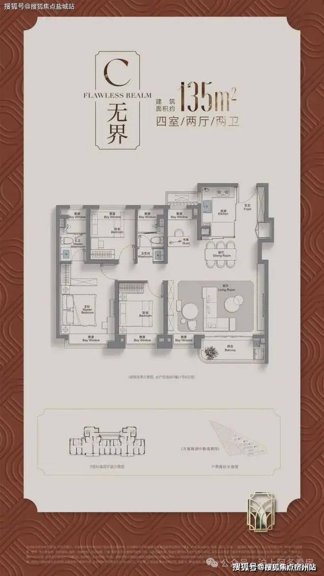 135㎡四房两卫大横厅设计,南向采光面达8.4米,主卧套房融入独立衣帽间;