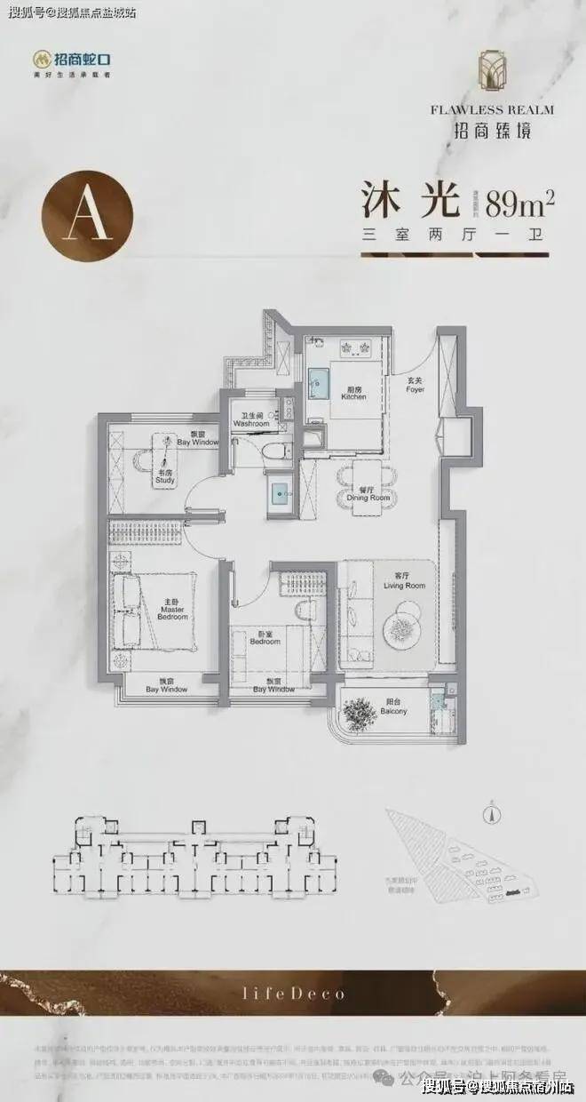 高层89㎡三房一卫采用“S墙”设计释放空间,三开间朝南+全卧室飘窗,总价456万起;