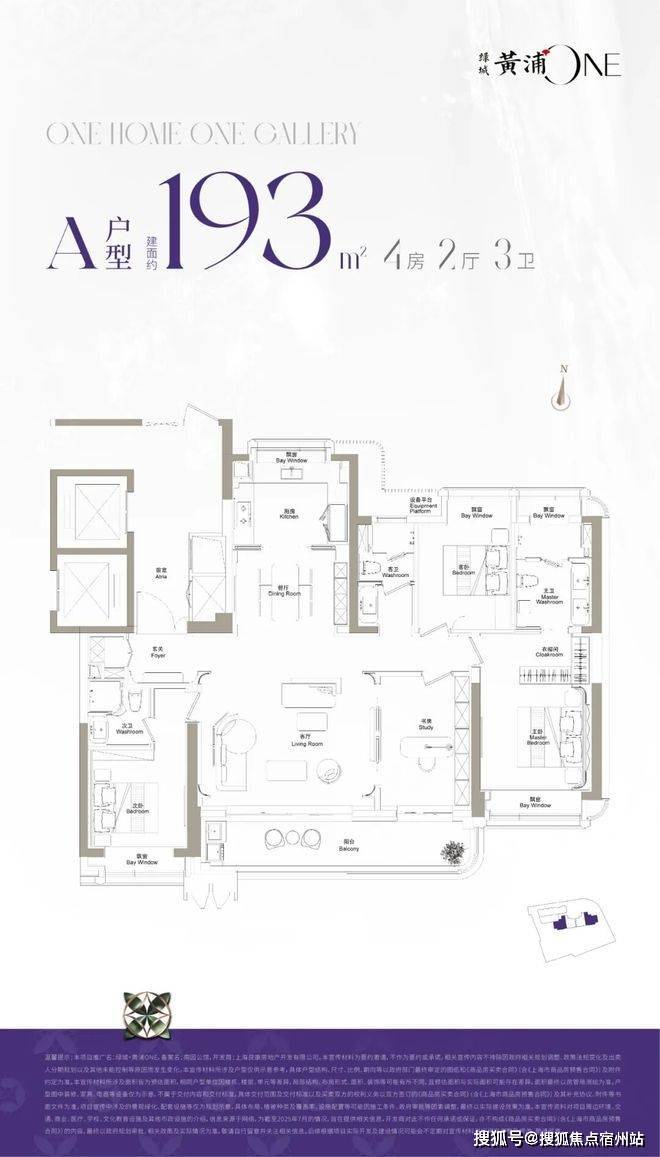 绿城·黄浦ONE规划了一幢住宅,两个户型依次排开,规整有序,边套是约193㎡4房2厅3卫,中间套是约155㎡3房2厅2卫户型,是纯粹改善大户型社区。