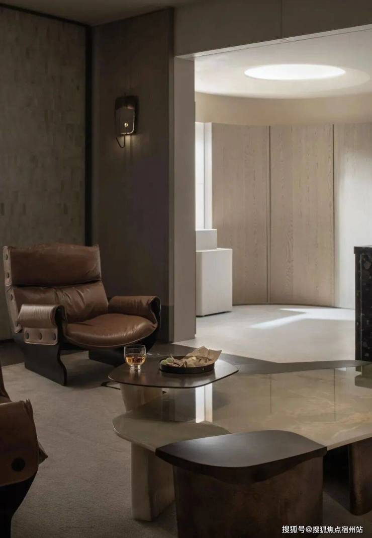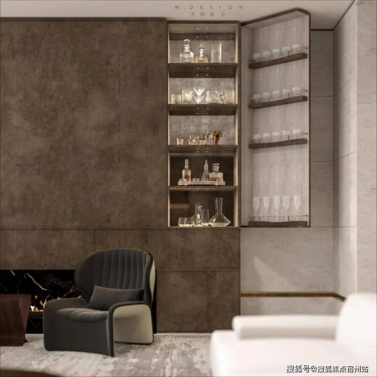 负一层的主要空间由沙龙和酒吧区构成。开放式的吧台中,灰色玛瑙般的大理石面斑驳似海浪,柜墙上流金的酒液散发着柔和的光,给人恰好的温度。整个洽谈空间典雅而不失深沉气度,低调而奢华。