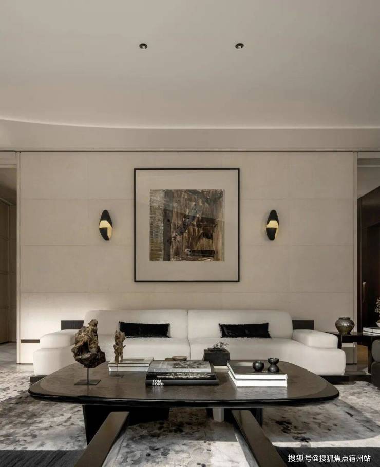 「海上」系列主沙发置于客厅中央,月白色与黛色巧妙地呼应了空间内的大漆案几。同样出自无间设计的泼墨地毯,使整个底部空间蕴含无尽的诗意。临案而坐,阅书鉴古,后方正挂着的《无题》画作与底部泼墨空间相照应,使居者包围在宁静自由的东方绘画意境之中,闲散而舒适。万象其间,独留余白。