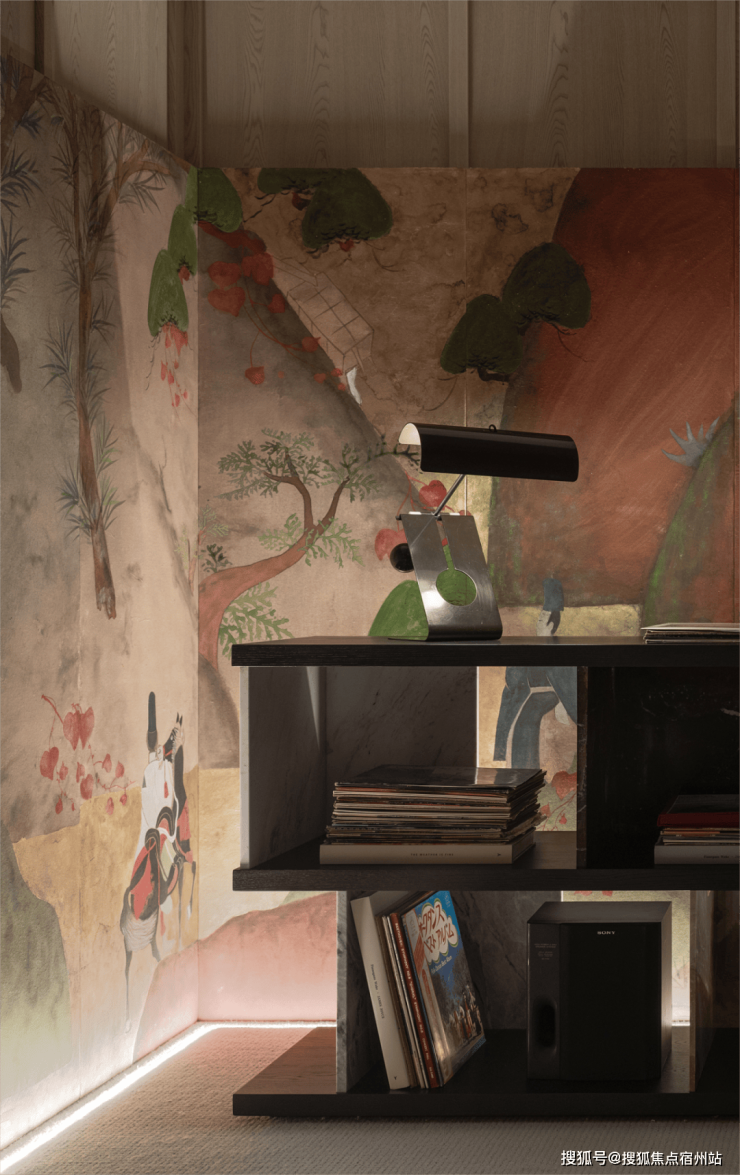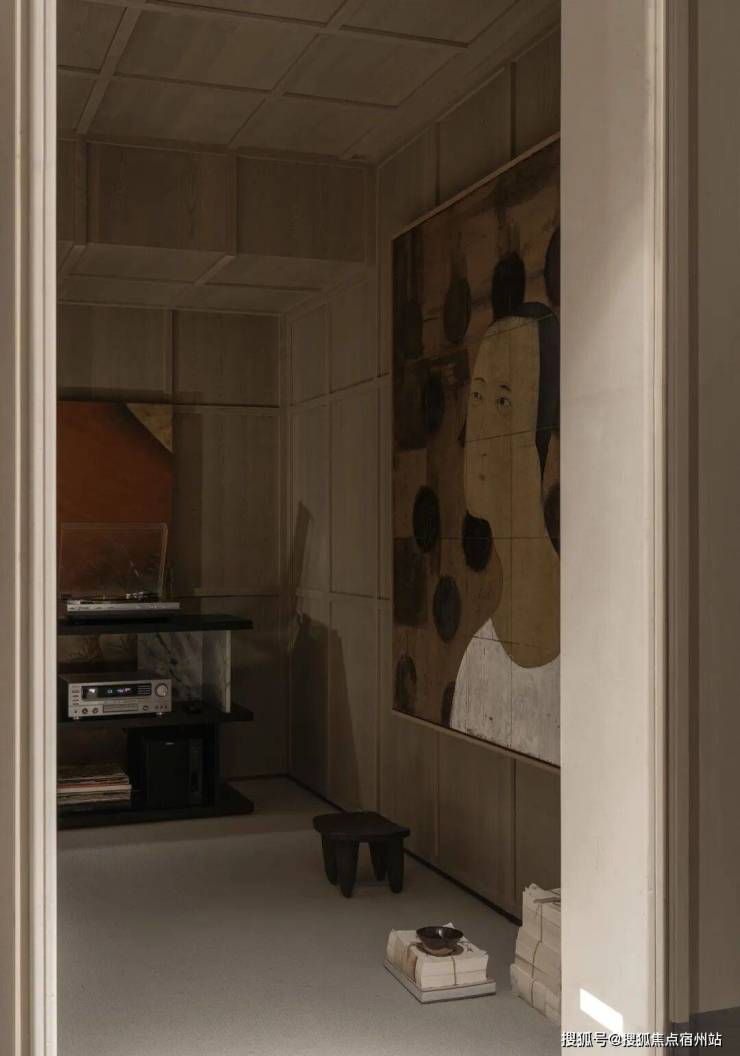 沙龙的一角通向主人的音乐厅,越过略显隐谧的入口向内窥探,视线刚好落在《看》这幅岩彩作品上。画笔与色彩交织奇思,象征着一个精神性空间的开端。进入音乐厅内,空间顿感开朗不少。耳边缓缓流动的音乐,如同是夜晚宁静的和弦。