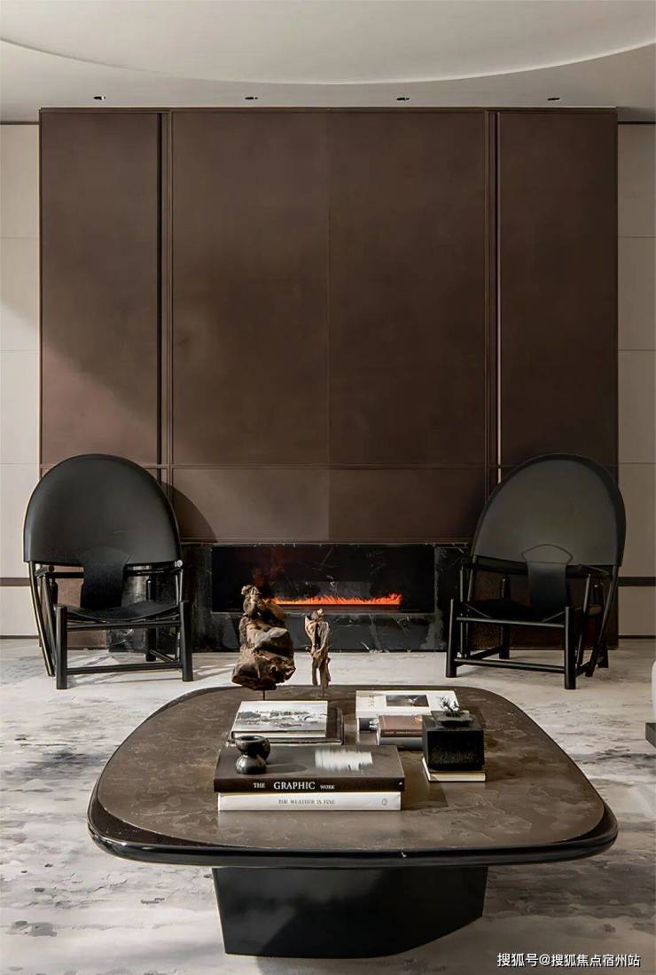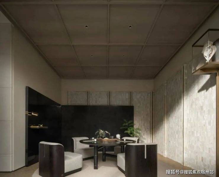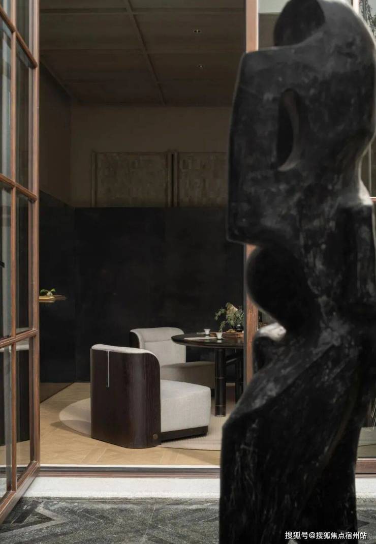 炉上茶氲袅袅,腾起如林间晨雾。中国园林讲究造景如“造境”,如此以为乐。“扫雪撼庭梅,烹茶折槛竹”,便是如此般的风雅景致。屏风,以温润的玉石马赛克勾勒,而树脂肌理漆则幽幽透明。与之相伴的是那自然静谧的大漆茶桌,是岁月的静谧痕迹。