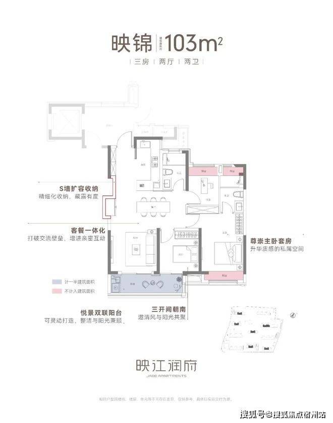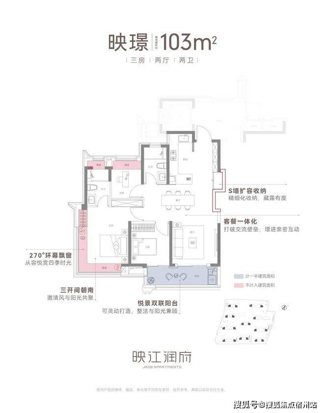 建筑面积约103㎡三房两厅两卫,不失为改善家庭的首选。其中边套户型,映江润府的主卧套房做了 270°环幕飘窗,实现无与伦比的采光通风和视野享受,类比于千万级豪宅的体验!