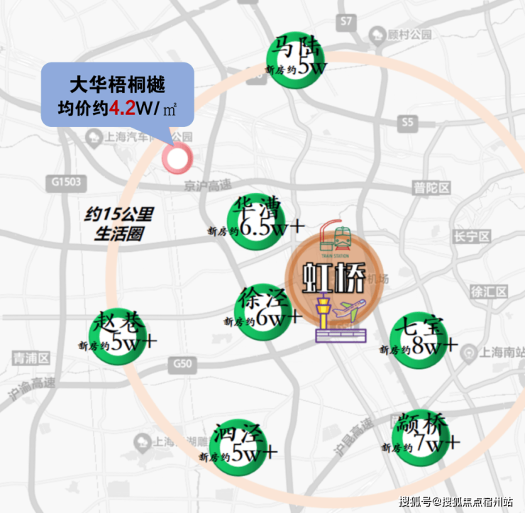 以虹桥为圆心,画一个半径约15公里的圈之后会发现。同样相距虹桥约15公里左右的马陆新盘价格基本上已经接近5w,泗泾、赵巷这些热门板块早已超过了5w,而颛桥更是达到了7w以上...... 「大华·梧桐樾」仅约4.2w的联动价显然更具优势。