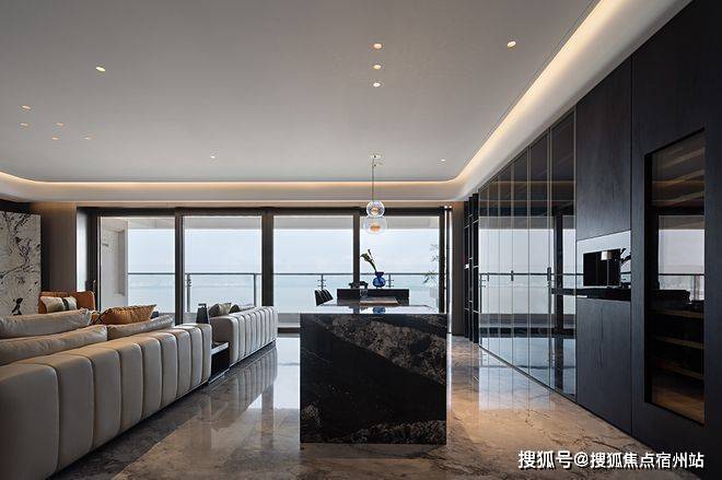 黑色岩板台面与整体色调形成戏剧性对比,赋予空间沉稳的质感。