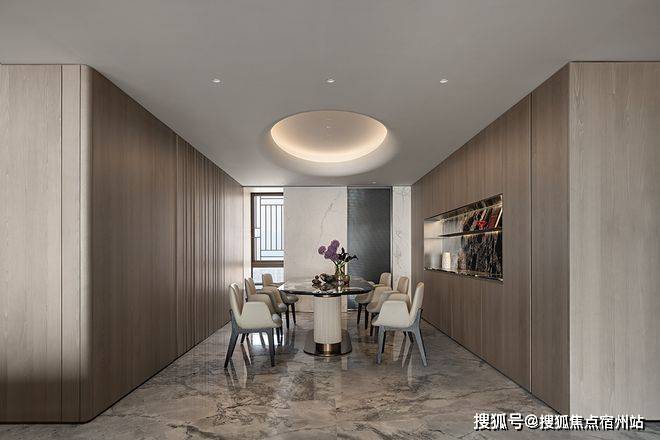 餐厅区域的设计独具匠心。设计师巧妙利用转角空间,通过木质餐椅与大理石地面的材质对话,营造出温馨的用餐氛围。区域尺度经过精确计算,既保证了使用的舒适性,又维持了整体的开放感。