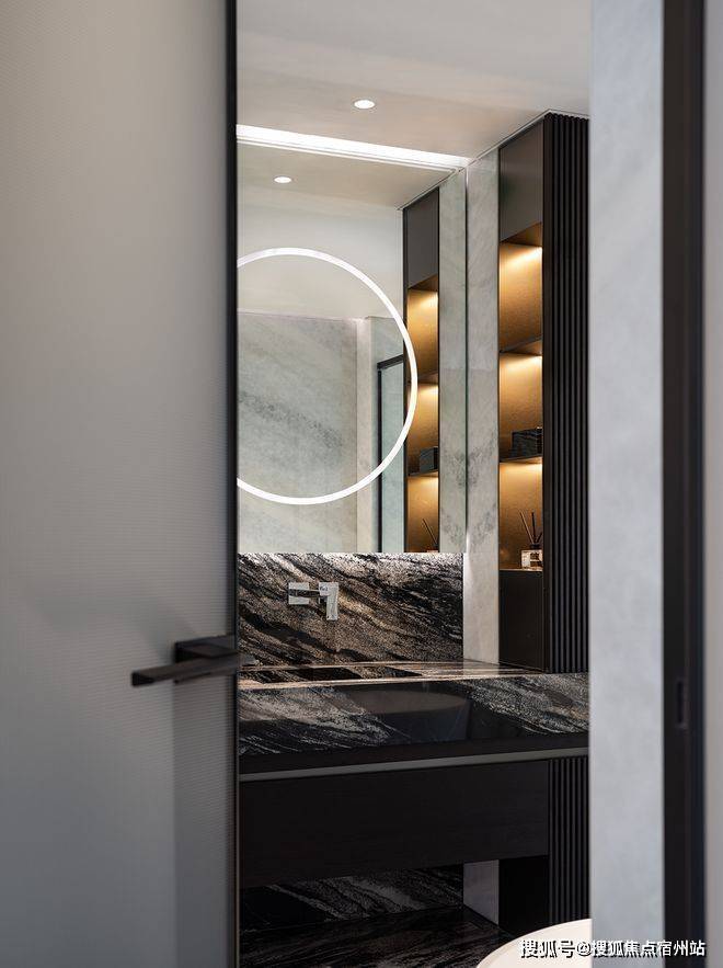 卫浴空间通过材质对比诠释私密性。黑曜石台面与暖色光源的搭配,创造出既沉稳又舒适的使用体验。干湿分离的布局,配合隐藏式排水系统,将功能性提升至艺术层面。
