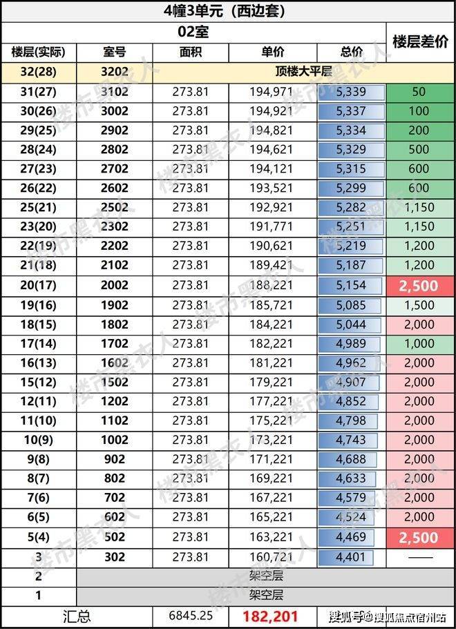 真正的价格跳跃,反而集中在中低区往中高区跨越的那一下。比如238㎡从20层到21层,单价差要达到 2500元/㎡ 。也就是说,西边套是在某几个关键舒适层、景观层上做了跳价,到了更高区以后,反而把价差压平。