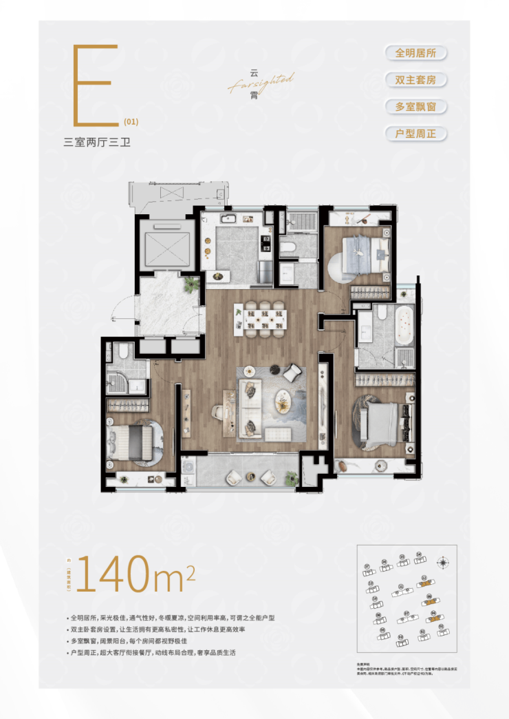 先来看建面约140㎡3房3卫户型,三开间朝南+大横厅的设计,整个南向采光面相当宽绰。